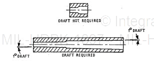 5.1.8 Draft. Draft is normally not specified except in special applications on deep perpendicular draws or in long untapered cored holes. The amount of draft required will depend upon the pattern material used, length (depth of draw), and wall thickness. The need for draft should be resolved between the casting source and engineering design. When required, draft should be specified in degrees or in taper per inch. A taper of 1 is considered acceptable in most instances (see figure 3).